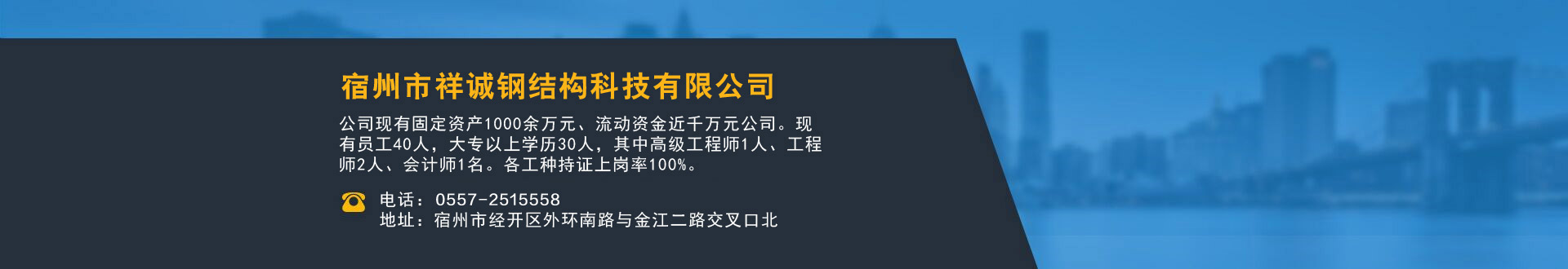 宿州市祥誠鋼結(jié)構(gòu)科技有限公司位于宿州市經(jīng)開區(qū)外環(huán)南路與金江二路交叉口北,公司是一家以建設(shè)產(chǎn)業(yè)化為目標(biāo),匯集大型鋼結(jié)構(gòu)廠房、彩鋼活動(dòng)房設(shè)計(jì)、制作、安裝施工一條龍服務(wù)的知名鋼結(jié)構(gòu)公司。公司現(xiàn)有固定資產(chǎn)1000余萬元、流動(dòng)資金近千萬元公司?,F(xiàn)有員工40人,大專以上學(xué)歷30人,其中高級(jí)工程師1人、工程師2人、會(huì)計(jì)師1名。各工種持證上崗率100%。高效化的年青團(tuán)隊(duì)為公司帶來了蓬勃發(fā)展的動(dòng)力,全體員工以務(wù)實(shí)的態(tài)度,拼搏的精神,創(chuàng)造著企業(yè)的每一天。 公司組織結(jié)構(gòu)嚴(yán)格按現(xiàn)代企業(yè)制度設(shè)計(jì),管理機(jī)構(gòu)設(shè)置合理,制度完善,各部門分工明確...
